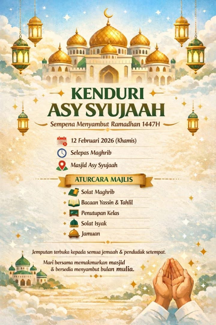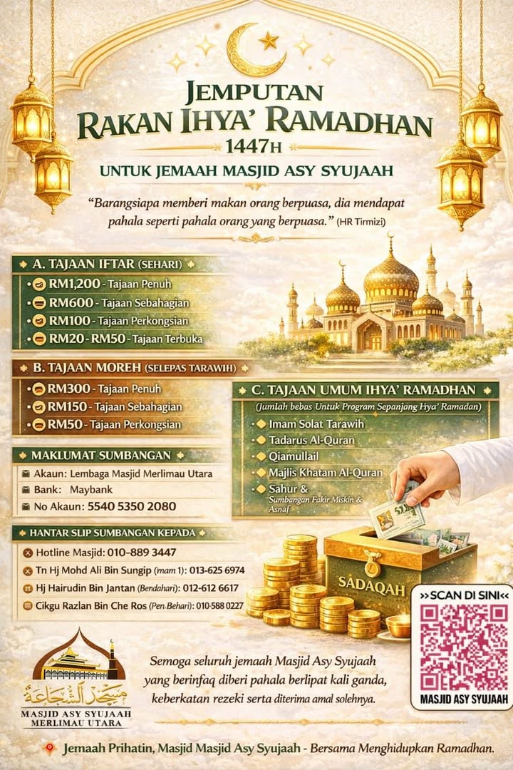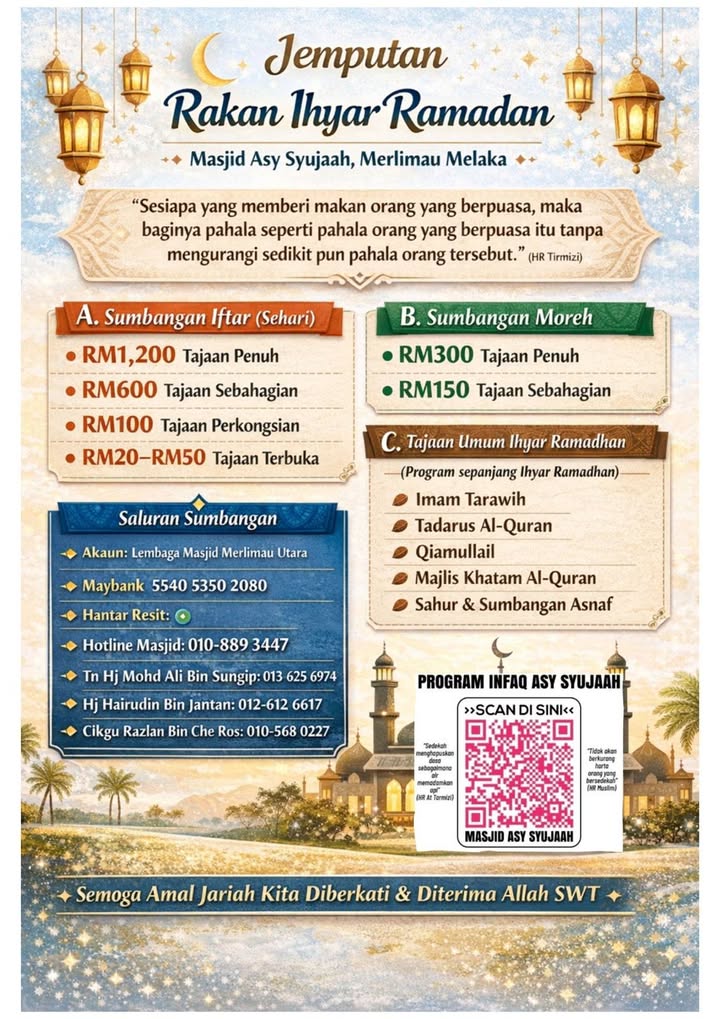 Asssalamualaikum w.b.t Derma Darah Pulak Guys..Asy Syuja\'ah mmg x rileks... *Program Derma Darah Asy Syujaah 18.0* Tarikh : 8.2.2026 (Ahad) Masa : 9.30pg - 2.00 tghr Lokasi : Lobi Masjid Asy Syujaa...