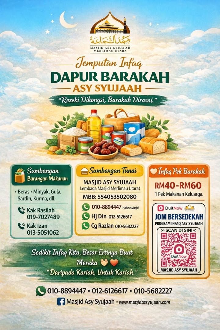 Assalamualaikum w.b.t.. Kepada individu , keluarga & pelajar yg ada masalah kewangan berbuka puasa jom iftar di Masjid Asy Syuja\'ah Merlimau Utara
