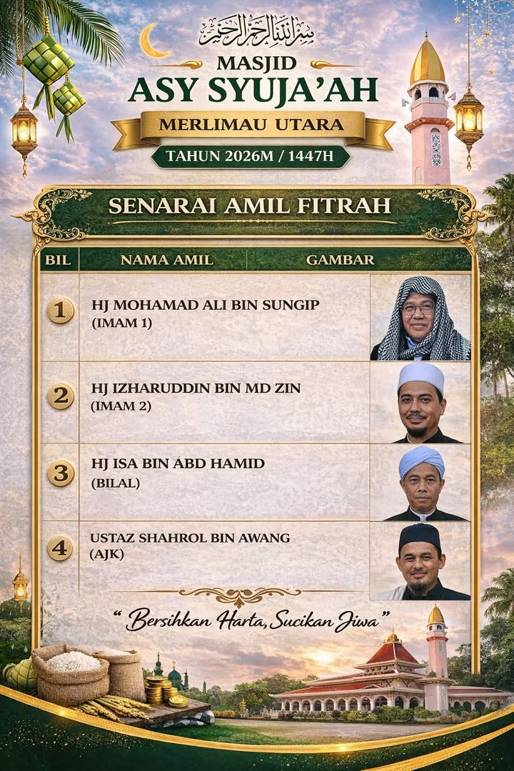 Assalamualaikum w.b.t Amil-Amil Zakat Fitrah Masjid Asy Syuja\'ah Merlimau Utara bukan sekadar membuka kaunter di Masjid atau lokasi-lokasi strategik tapi menjalankan amanah memudahkan umat islam ya...