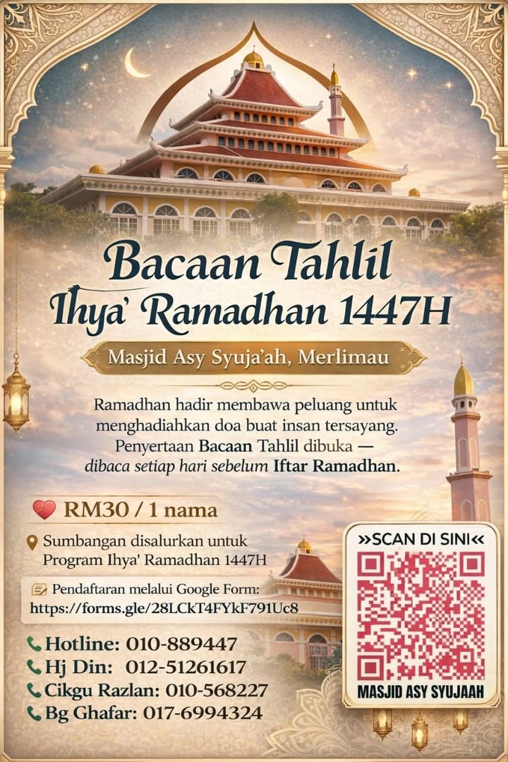Assalamualaikum w.b.t Pengurusan Masjid Asy Syuja\'ah Merlimau Utara telah mengadakan mesyuarat Jawatankuasa bagj membincangkan persediaan Ramadhan dan Aldilfitri serta pembangunan Masjid. Biro Urus...