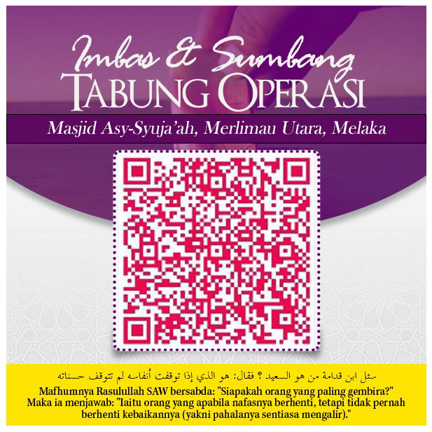 Sumbangan ini bertujuan bagi menampung kos operasi Masjid Asy-Syuja'ah, Merlimau Utara, Melaka seperti utiliti (elektrik/air/unifi), penyelenggaraan dan operasi, pembangunan, majlis ilmu online, aktiviti dan program pengimarahan di Masjid Asy-Syuja'ah, Merlimau Utara, Melaka.
